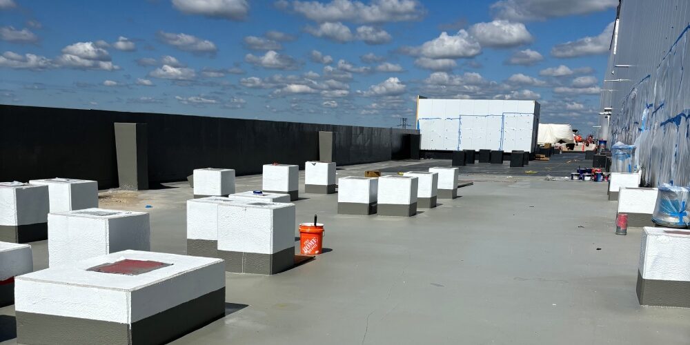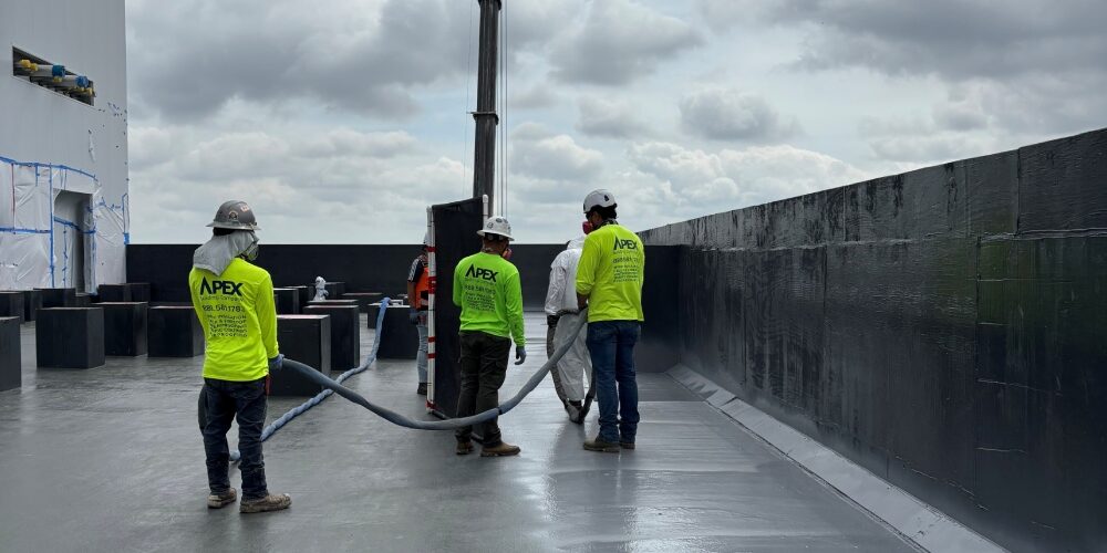Apex Building Company partnered with Polyglass due to the complexity of the project schedule. The waterproofing had to be installed increments of 10,000 sqft which can make waterproofing continuity a challenge. The Tecnocoat product with its fast curing time and easy tie in solution was ideal for completing this project on time and within budget.